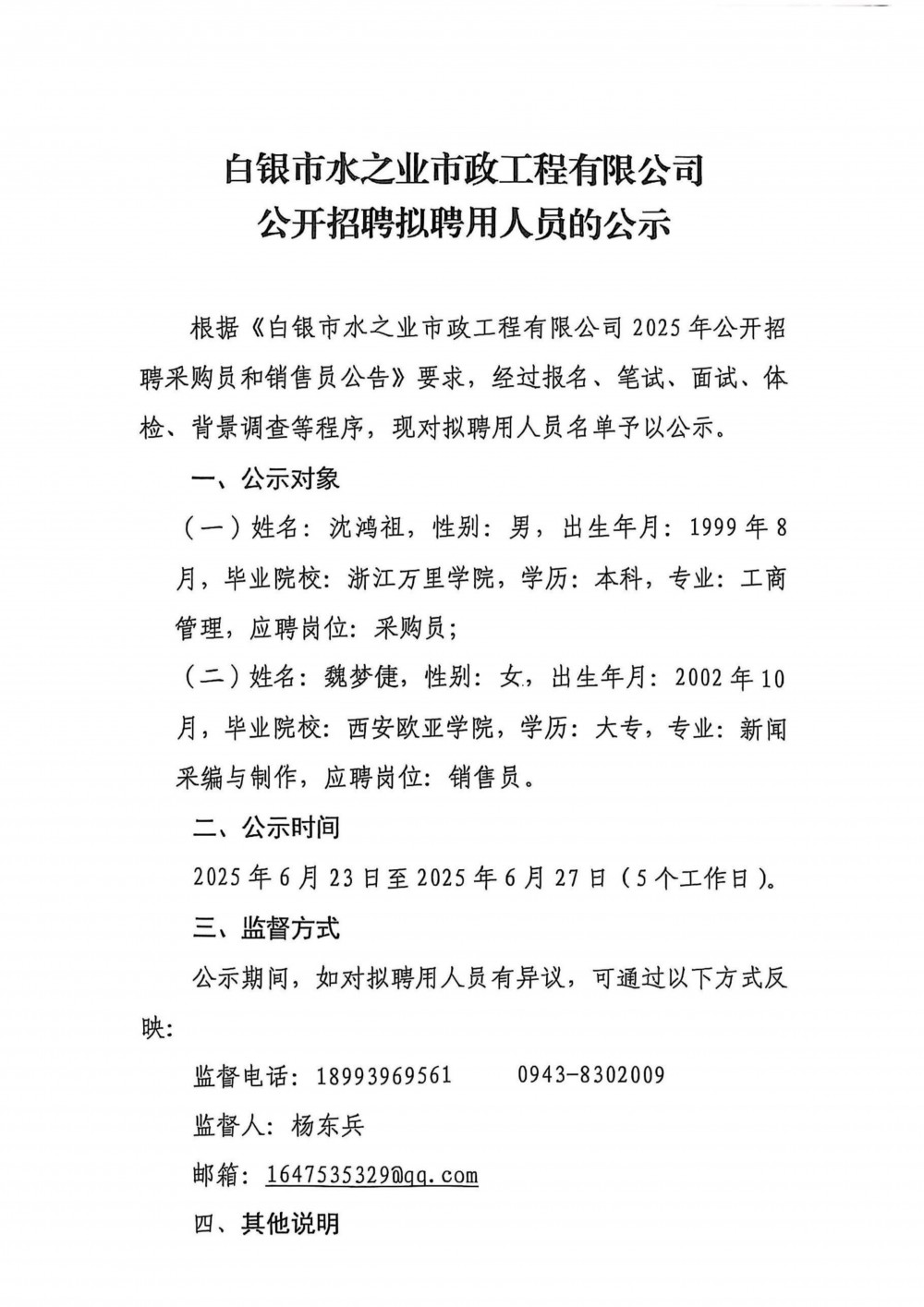 白銀市水之業(yè)市政工程有限公司公開(kāi)招聘擬聘用人員的公示